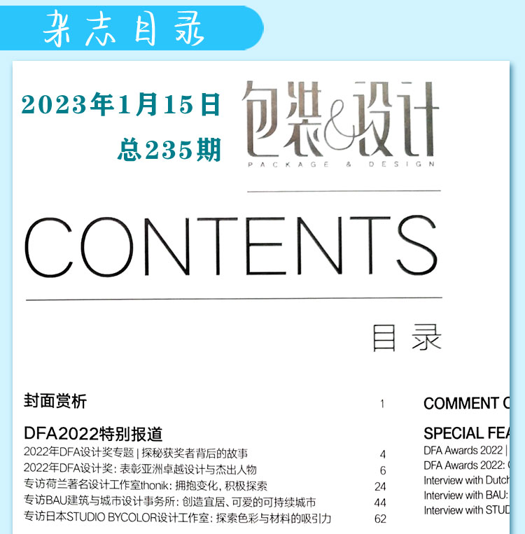 《包裝&設計》雜志創(chuàng)刊于1973年,是一本在全國具有影響力的專業(yè)設計雜志。作為聯(lián)系國內(nèi)外企業(yè)、設計師和設計院校的橋梁,雜志多年來為中國包裝事業(yè)的發(fā)展和中外設計交流不遺余力。