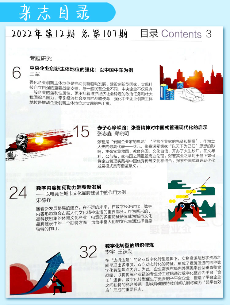 重點(diǎn)欄目包括專稿、管理論壇、專題研究、經(jīng)濟(jì)觀察、案例研究等,稿源主要來(lái)自具有豐富管理實(shí)踐和專業(yè)知識(shí)的企業(yè)高管和咨詢機(jī)構(gòu)的專家、政府機(jī)構(gòu)的專家以及具有深厚學(xué)術(shù)功底的高校和研究機(jī)構(gòu)的學(xué)者,高水平而又多樣化的作者群體保證了每一篇文章的質(zhì)量。
