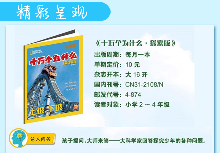 《十萬個(gè)為什么探索版》是中國(guó)少兒科普品牌雜志,主要介紹科學(xué)、地理、生活百科等知識(shí)。啟迪科學(xué)智慧激發(fā)小讀者的求知欲和對(duì)科普知識(shí)的興趣!妒f個(gè)為什么》系列有啟蒙版,探索版,發(fā)現(xiàn)版3個(gè)版本,《十萬個(gè)為什么(啟蒙版)》適合1-2年級(jí)孩子科普啟蒙!妒f個(gè)為什么(探索版)》適合2-4年級(jí)孩子科普探索,《十萬個(gè)為什么(發(fā)現(xiàn)版)》適合4-6年級(jí)孩子科普發(fā)現(xiàn)。
