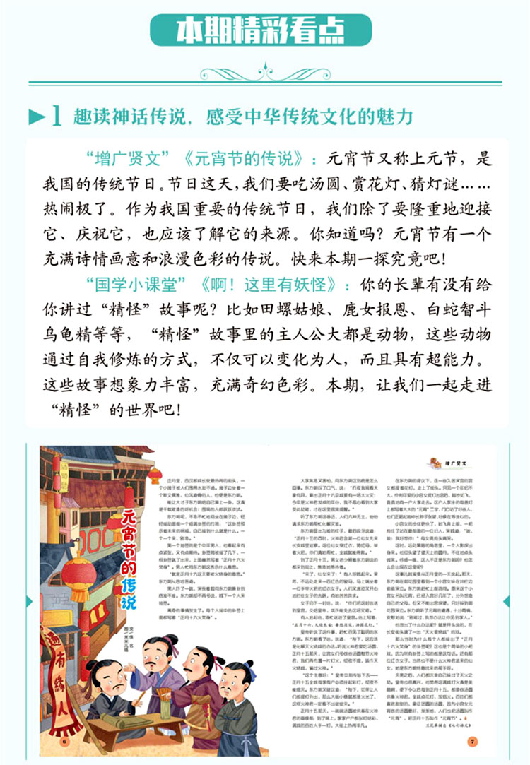 《意林·小國學》,中小學傳統文化養成讀本,青少年國學知識備考刊物。它注重對青少年傳統文化素養、閱讀理解能力、表達能力的培養,從傳統國學寶藏中汲取精華,選取符合學生閱讀習慣的動人故事,將海量國學知識點融入其中,以活潑有趣的圖畫形式展現,讓孩子們愛上國學經典,增加傳統文化底蘊,提高人文素養,在閱讀中領悟中華傳統文化的魅力。內容涵蓋神話故事、歷史故事、人物故事、詩詞成語、傳統節日等多個板塊,涉及文學、美學、哲學、音樂、藝術.書法、繪畫等各個方面,搜羅課本上學不到的故事,補充課外所需語文基礎知識,從小讓孩子讀經典,面對初高中的國學經典書目才能水到渠成,是一本專為7到15歲青少年打造的不可多得的國學刊物。解決孩子不愛閱讀,語文基礎知識薄弱等問題。它以五千年歷史的深邃眼光,賦予孩子歷代圣賢的崇高智慧,延續中華英雄兒女的大愛氣節,鍛造孩子心懷天下的博大胸懷;提前為小升初及中高考語文傳統文化、國學知識相關題目備考,創刊至今,多次 “巧遇”全國多地小升初和中考語文考試題內容,是一本值得收藏的備考雜志。